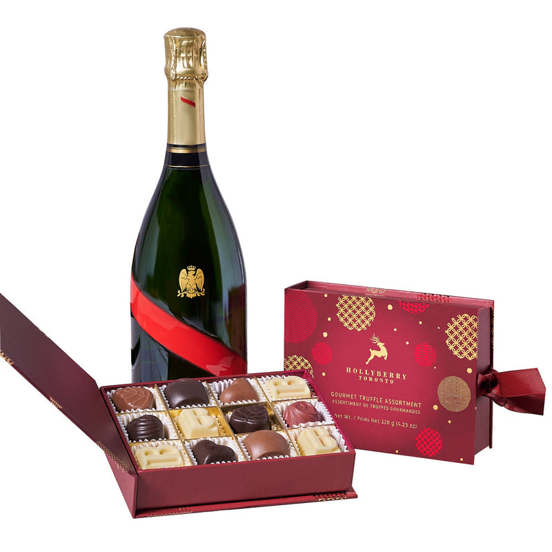 Send some very welcome season's greetings with the Holiday Champagne & Chocolate Gift. This lovely holiday gift set is sure to be a hit with the bottle of sparkling wine and box of seasonal holiday chocolate truffles. Delight anyone on your gift list with this fabulous gift! You can even make it more special by adding on floral arrangements, bouquets, seasonal plants, and more from our custom options.